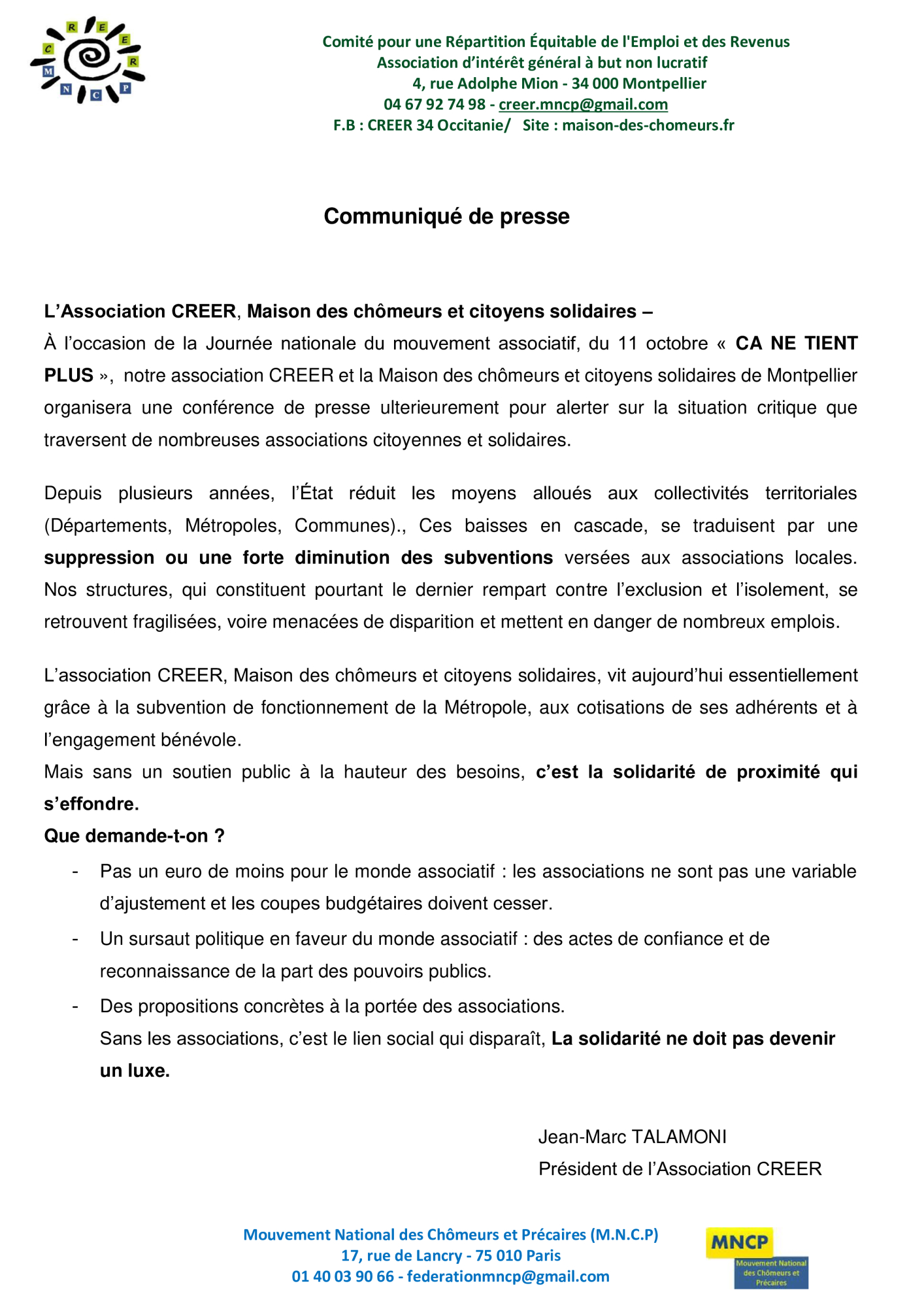 À l’occasion de la Journée nationale du mouvement associatif, du 11 octobre « CA NE TIENT PLUS », notre association CREER et la Maison des chômeurs et citoyens solidaires de Montpellier organisera une conférence de presse ulterieurement pour alerter sur la situation critique que traversent de nombreuses associations citoyennes et solidaires.